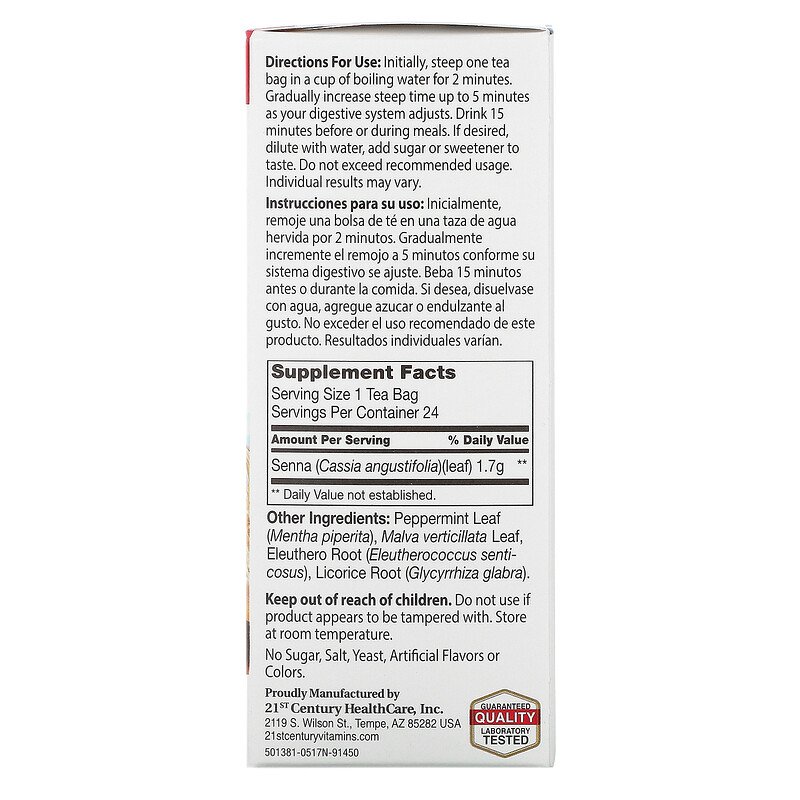 Notice: This product contains Senna leaves. Read and follow directions carefully. Do not use if you have or develop diarrhea, loose stools, or abdominal pain. Consult your physician if you have frequent diarrhea. If you are pregnant, nursing, taking medication, or have a medical condition, consult your physician before using this product.