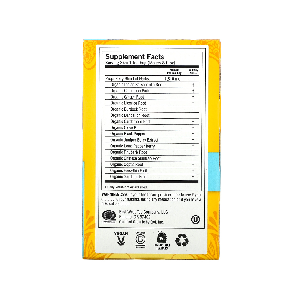 We combine time-honored cleansing herbs Burdock and Dandelion with Juniper Berry and traditional Ayurvedic blend “trikatu” (Ginger, Black Pepper and Long Pepper). Indian Sarsaparilla, Licorice, Cinnamon, Cardamom and Clove round out this deliciously spiced blend. As part of an overall wellness program, DeTox tea helps bring healthy balance from within.